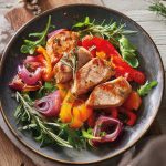 Marinierte Putenschnitzel aus dem Ofen mit Paprika, Zwiebeln und Salat