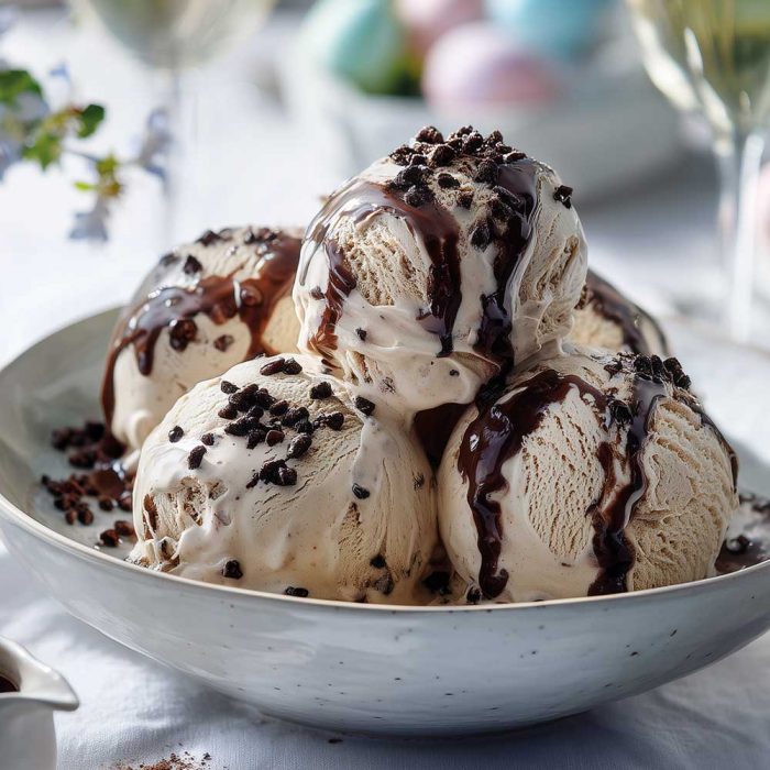 Chocolicious Chai-Latte-Eis mit Schoko-Sauce und Kakao-Nibs