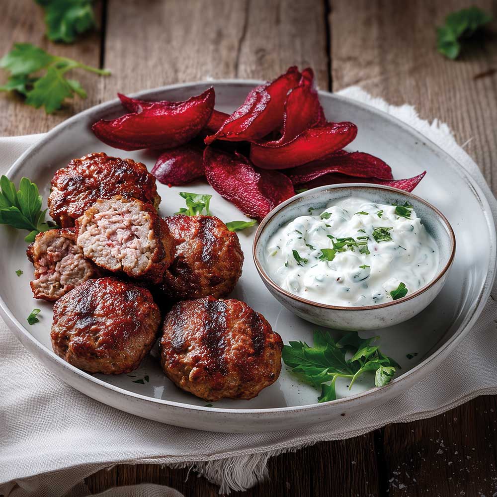 Bifteki mit Rote-Bete-Chips und Zaziki