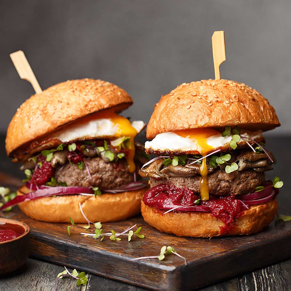 Untere Brötchenhälfte mit Rote-Bete-Creme bestreichen. Rote Zwiebelringe darauflegen. Heißes Patty daraufsetzen, mit Pilzen und dem Spiegelei toppen. Microgreens darüberstreuen. Obere Brötchenhälfte auflegen.