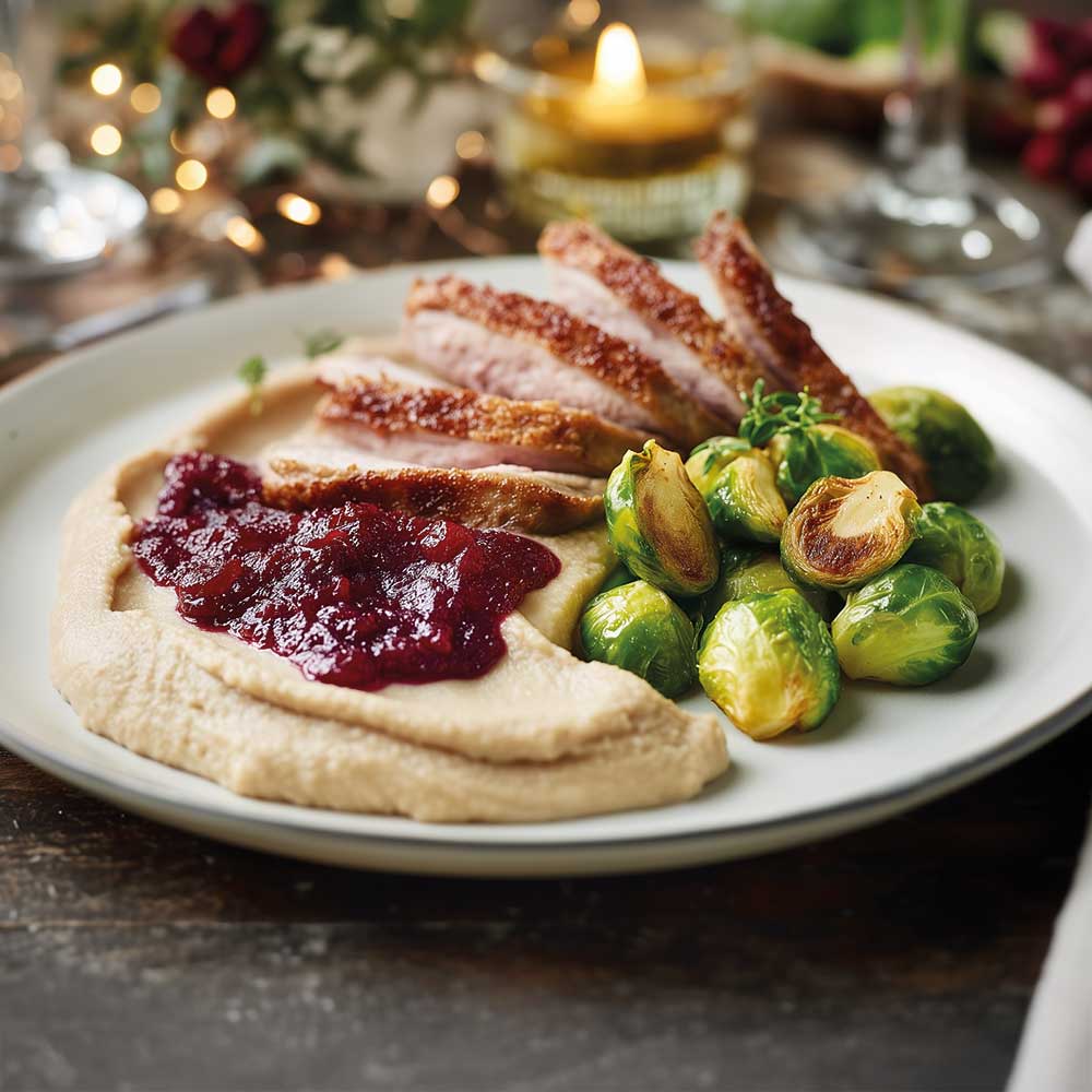 Entenbrust in Scheiben schneiden, mit Maronenpüree, Rosenkohl und Sauce anrichten.