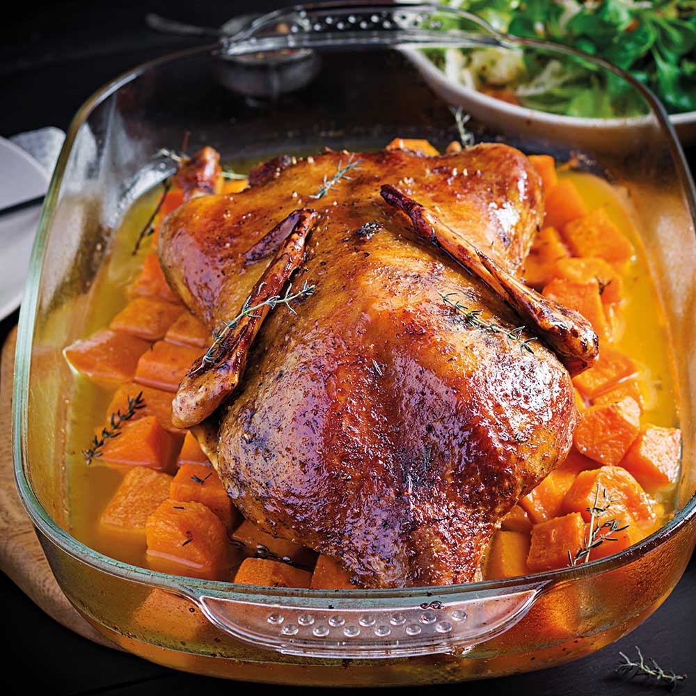 Kürbis entkernen, in grobe Würfel schneiden und in den letzten 45 Min. mit in den Bräter geben. Mit Salz und Thymian würzen.