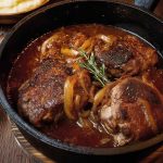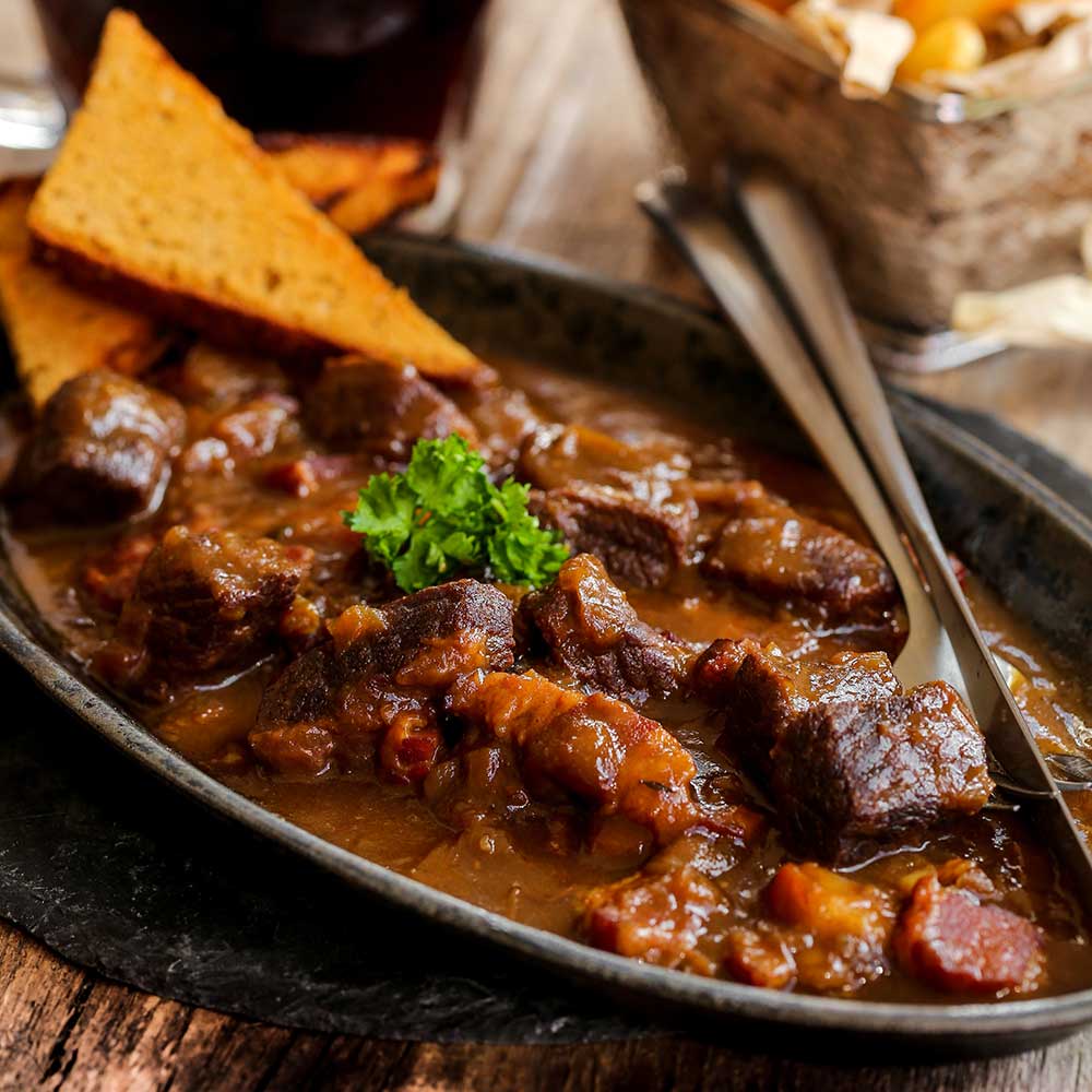 Zuletzt die Kuchenscheiben (mit der bestrichenen Seite nach oben) auf das Fleisch legen, zugedeckt weitere 60 Min. schmoren lassen und dabei immer wieder umrühren. Zuletzt kräftig abschmecken und servieren.