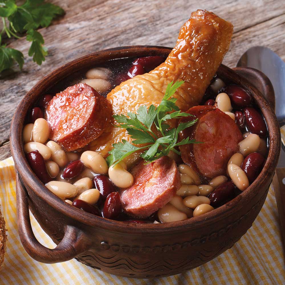 Fleisch und Würste zum Bohneneintopf geben, gut umrühren und mit Salz und Pfeffer abschmecken. Weitere 20 Min. auf kleiner Flamme ziehen lassen.