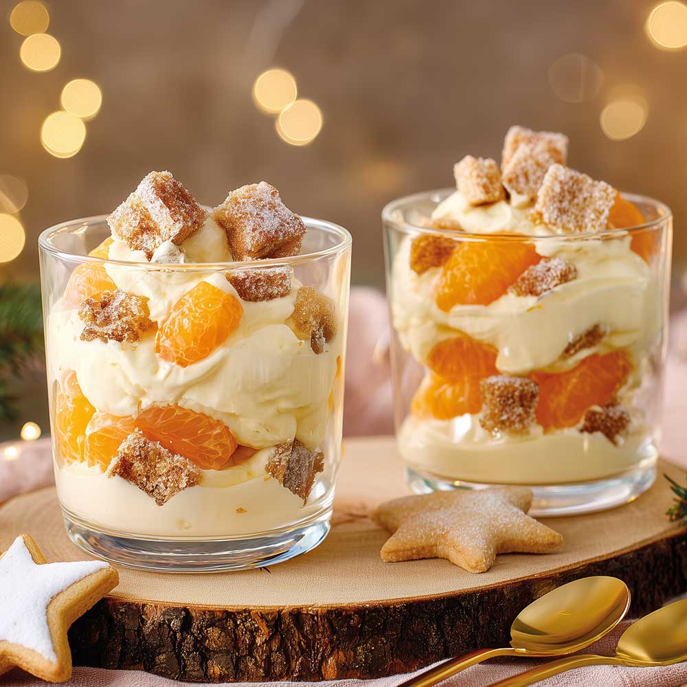 Abwechselnd Pudding, Stollenstücke und Mandarinen in Gläser schichten. Kalt stellen. Vor Servieren mit Zimt bestreuen.