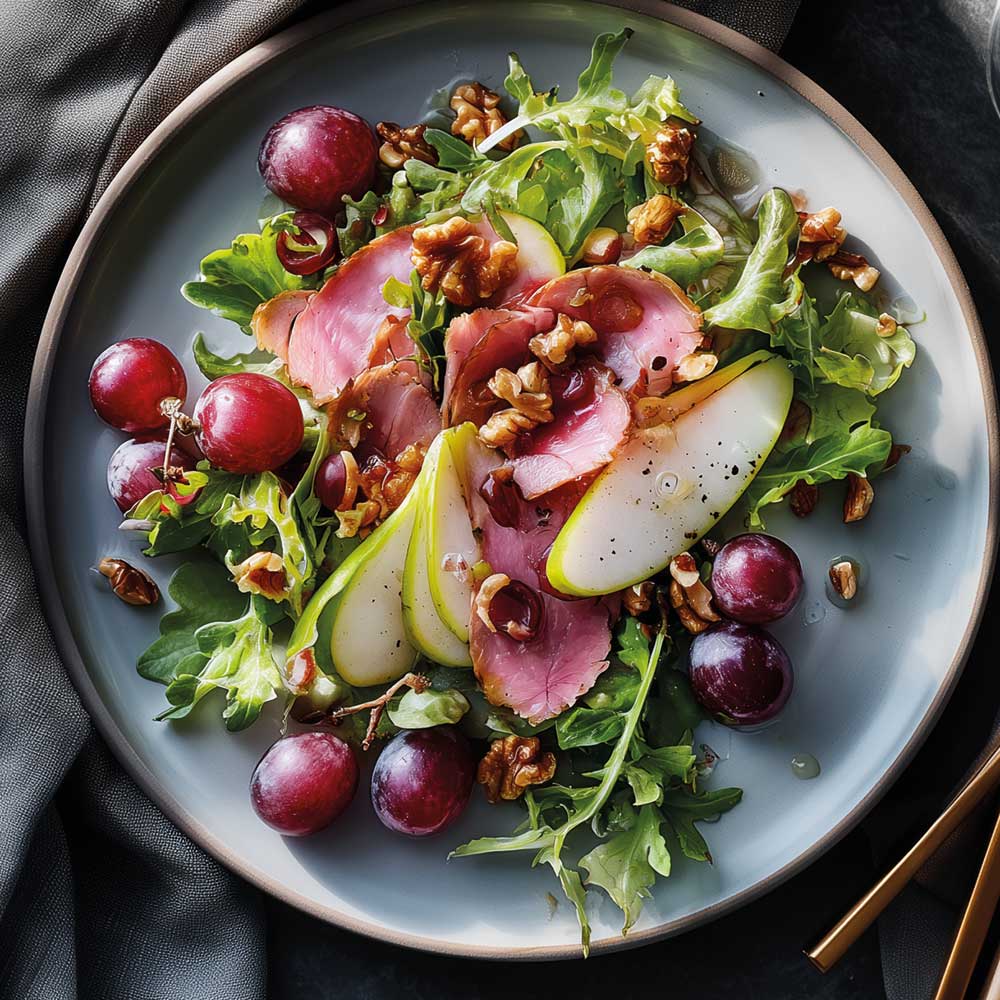 Geräucherte Gänsebrustscheiben auf Feldsalat mit Birnen und Trauben