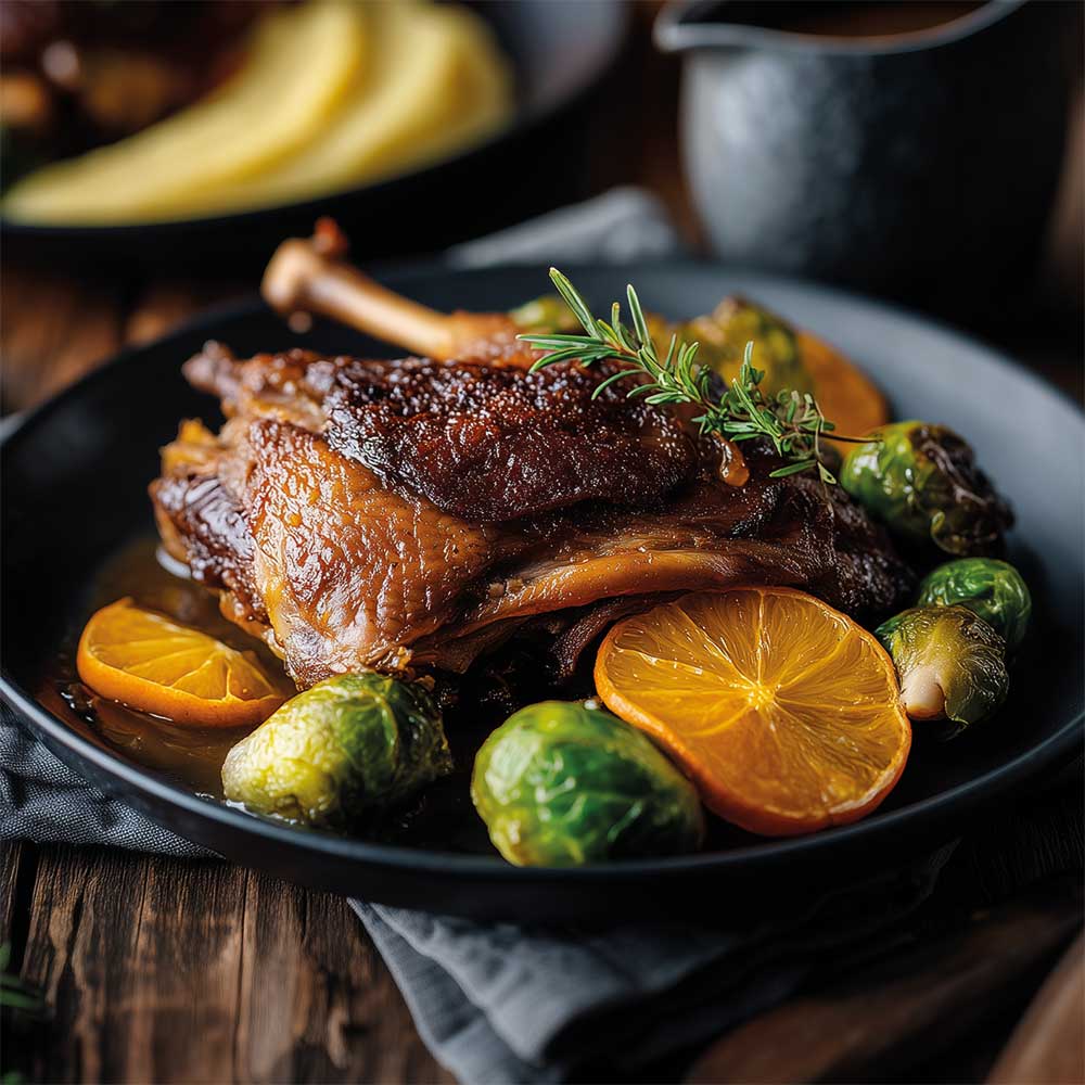 Schmorgemüse aus dem Bräter entfetten. Gemüse zum separat eingekochten Fond geben. Aufkochen. Saucenansatz durch ein feines Sieb in einen weiteren Topf passieren. Nach Belieben mit Saucenbinder binden. Gänsekeulen und Rosenkohl anrichten. Sauce dazu reichen. Dazu passt: Kartoffel- oder Maronenpüree. Unser Deko-Tipp: Richten Sie gegrillte Orangenscheiben mit auf die Teller an.