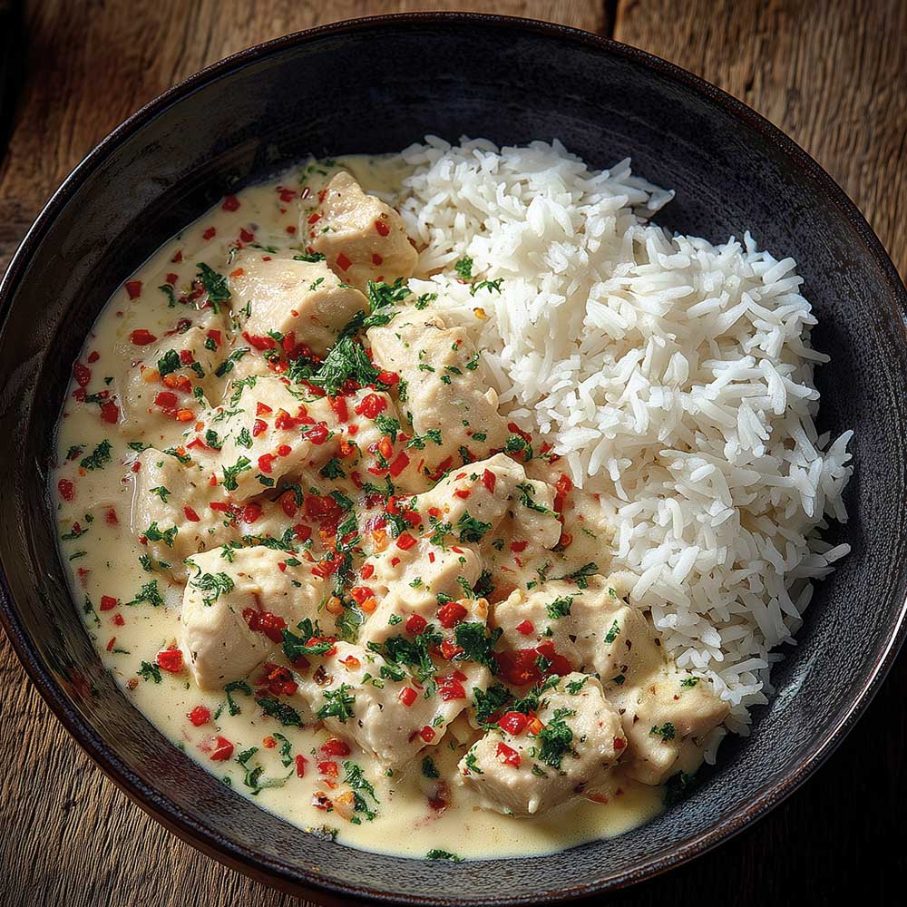 Hähnchenstücke zurück in die Pfanne geben, ca. 10 Min. bei mittlerer Hitze ziehen lassen. Mit Reis servieren und nach Belieben nachwürzen.