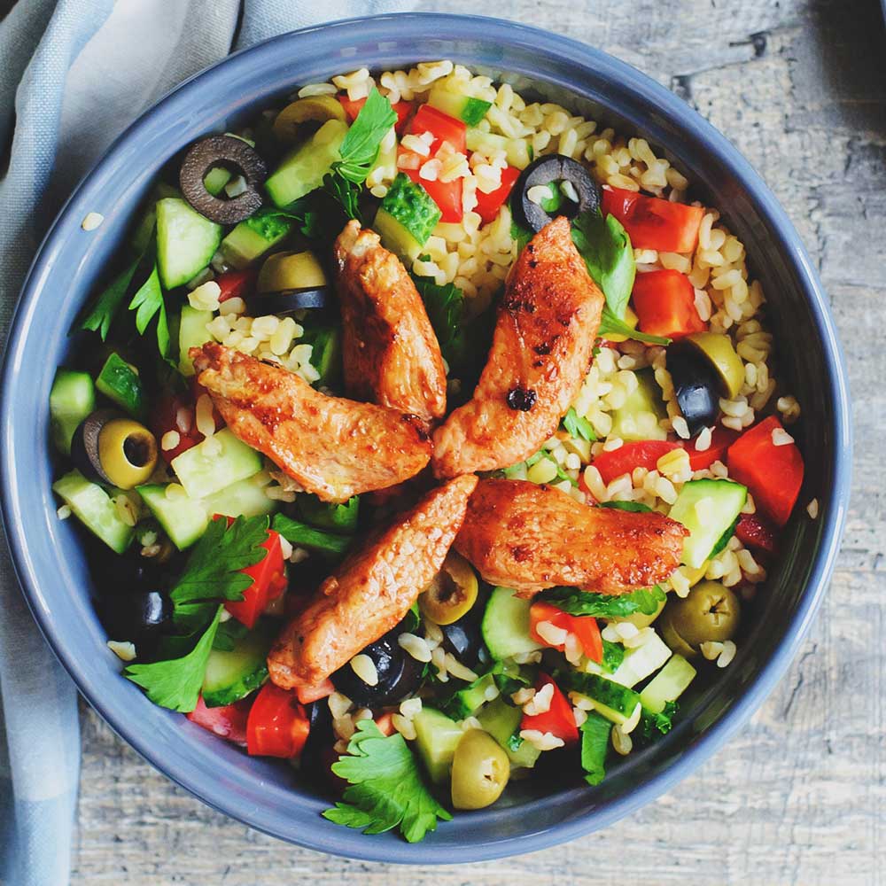 Fleisch aus der Marinade nehmen und abtropfen lassen. Restliches Öl in einer Pfanne erhitzen und das Fleisch darin etwa 10 Min. braten. Immer wieder umrühren, damit es von allen Seiten gar wird. Bulgur zur Salat-Mischung geben, vorsichtig unterrühren, Hähnchengeschnetzeltes darauf legen und servieren.