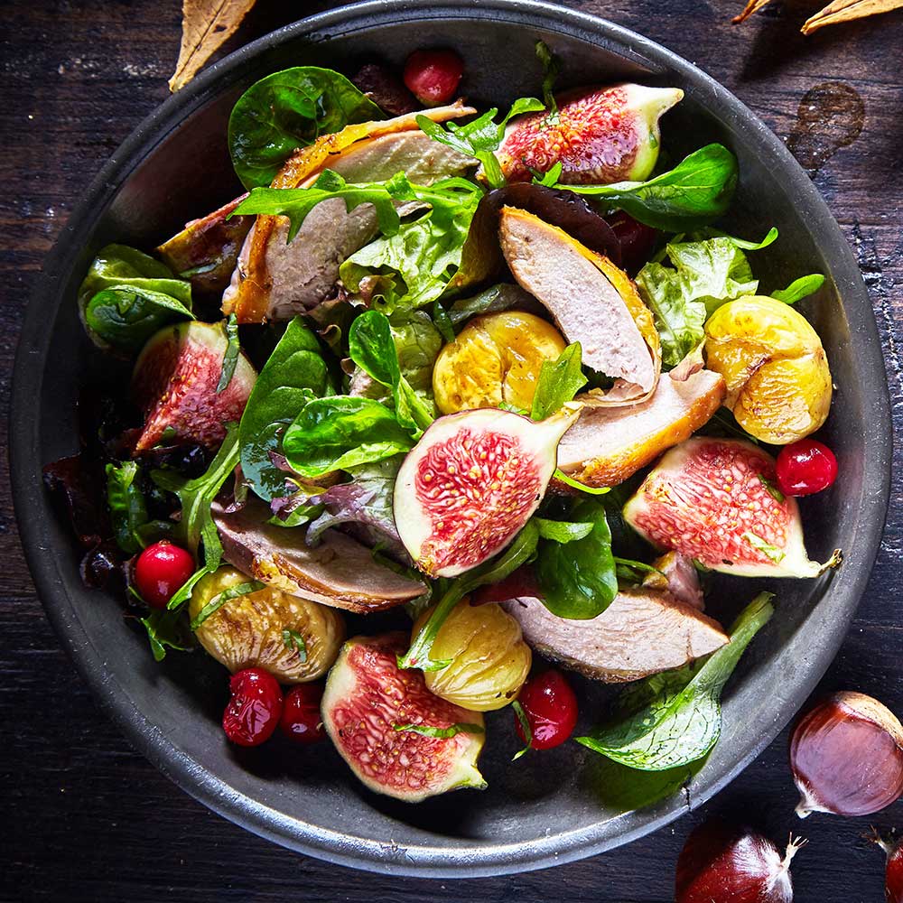 Salat waschen, trocken schleudern und mit Feigen, Maronen und Cranberries in einer großen Schüssel vermengen.