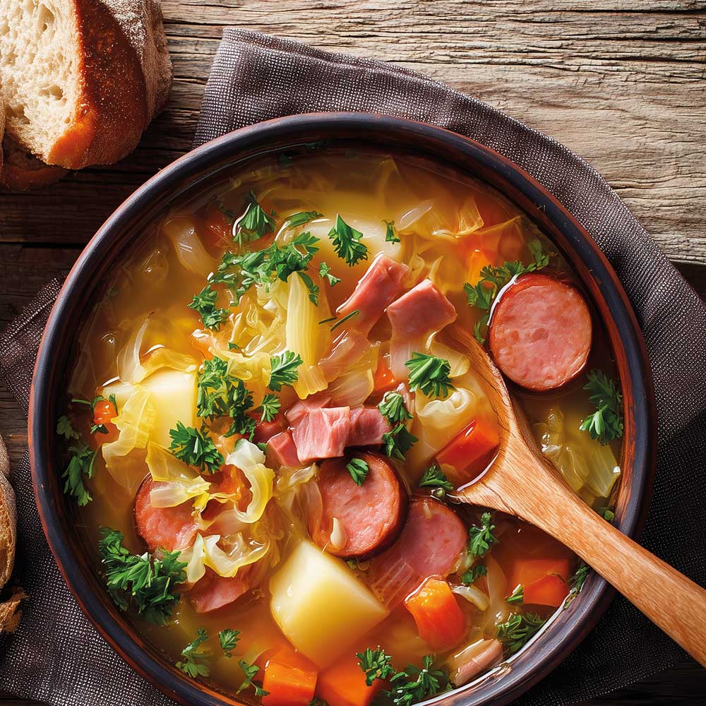 Zwiebel und Porree im Öl ca. 3 Min. andünsten. Sauerkraut und Möhren zufügen, ca. 5 Min. kräftig anschmoren. Kartoffelwürfel, Lorbeerblatt und Wacholderbeeren zufügen. Brühe angießen, Tomatenmark einrühren. Alles aufkochen, bis Kartoffeln und Möhren gar sind.