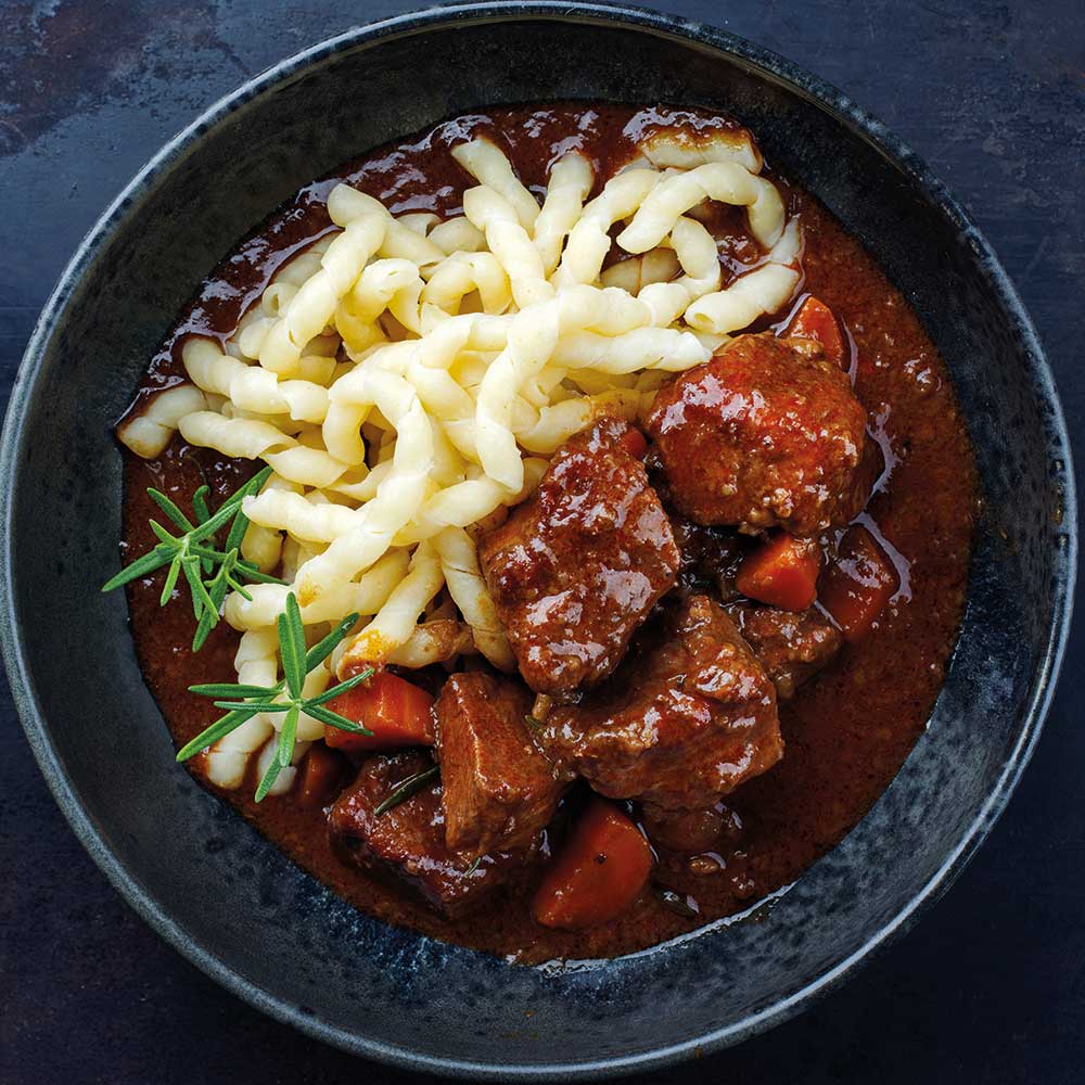 Pasta kurz vor Ende der Garzeit des Gulasch‘ nach Packungsanweisung zubereiten und zum fertigen Fleisch servieren.