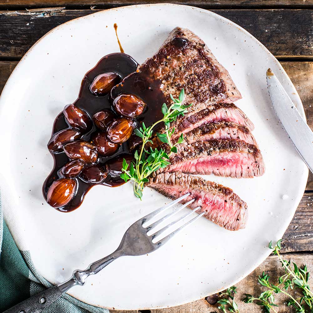Lecker Hüftsteak mit Perlzwiebeln als Beilage