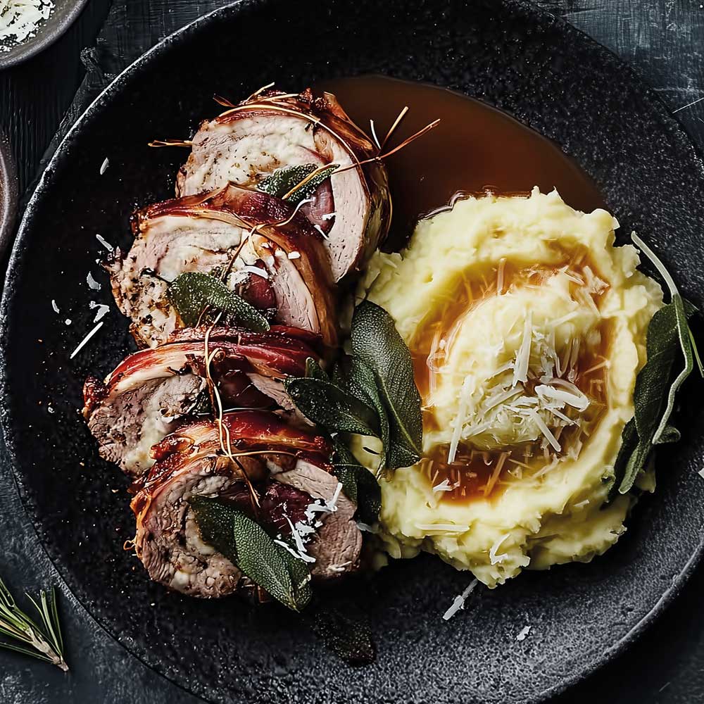 Braten in Scheiben schneiden, mit Sauce servieren. Dazu passt Kartoffelpüree, getoppt mit geraspeltem Parmesan.