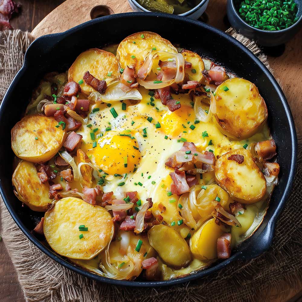 Eier mit Milch, Salz und Pfeffer verquirlen, über die Kartoffeln geben. Bei mittlerer Hitze und geschlossenem Deckel für ca. 5 Min. stocken lassen. Mit sauer eingelegtem Gemüse und Schnittlauch servieren.