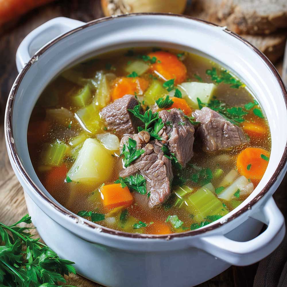 Rindfleisch herausnehmen und in mundgerechte Stücke schneiden. Dann zurück in den Topf geben und die Suppe mit Salz, Pfeffer und Petersilie abschmecken.