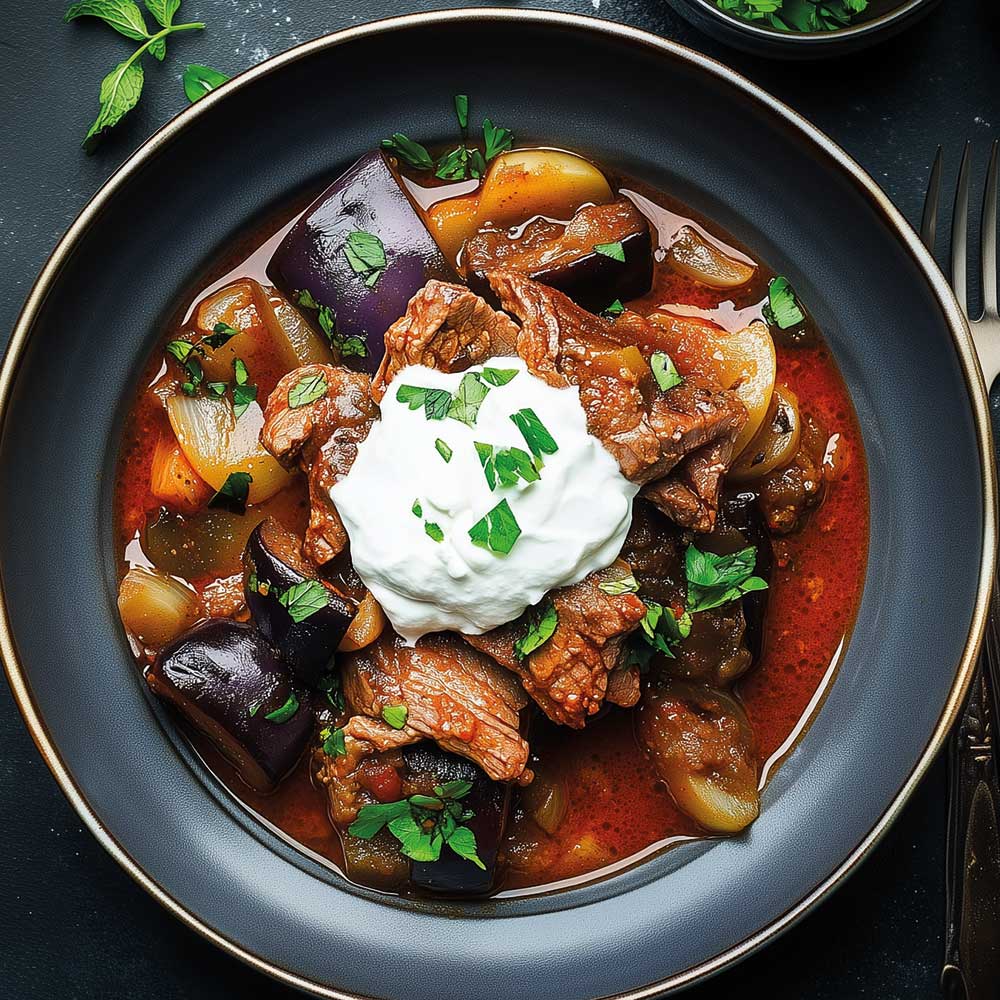 Auberginen aus dem Ofen nehmen, bei Bedarf nochmals grob schneiden und unter das Fleisch heben. Mit Fond oder Brühe auffüllen und alles weitere 5–10 Min. leise köcheln lassen.