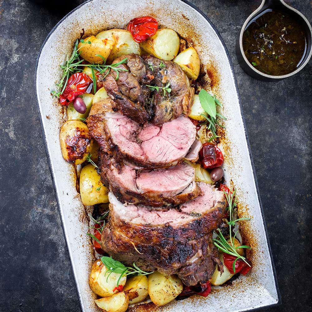 Marinierter Lammbraten mit Tomaten, Kartoffeln und Oliven