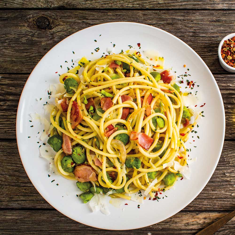 Vorbereitete dicken Bohnen sowie Chiliflocken in die Pfanne geben. Alles bei mittlerer Hitze 2–3 Min. durchschwenken.