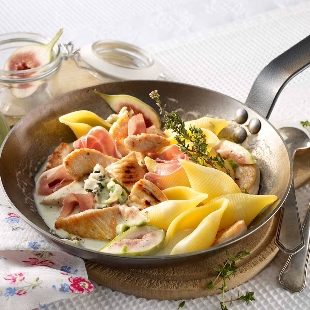 In einer Pfanne Putenfleisch im Butterschmalz von allen Seiten kräftig anbraten. Schalotten und Feigen hinzufügen, ca. 2 Min. anschwitzen. Mit Fond und Sahne auffüllen, kurz aufkochen.