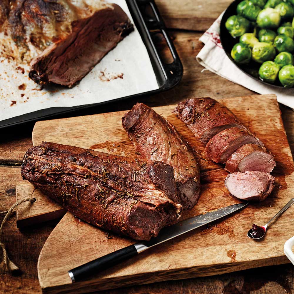 Rehrücken auf ein mit Backpapier ausgelegtes Backblech legen. Im Ofen ca. 1 Stunde garen. Bei Verwendung eines Fleischthermometers nahe am Knochen platzieren, Kerntemperatur auf 75 °C einstellen.