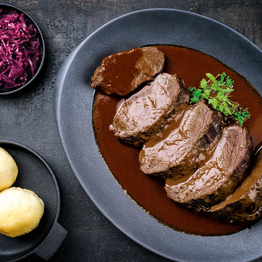 Fleisch in Scheiben schneiden, mit der Sauce anrichten. Klassische Beilagen: Kartoffelklöße und Apfelrotkohl.