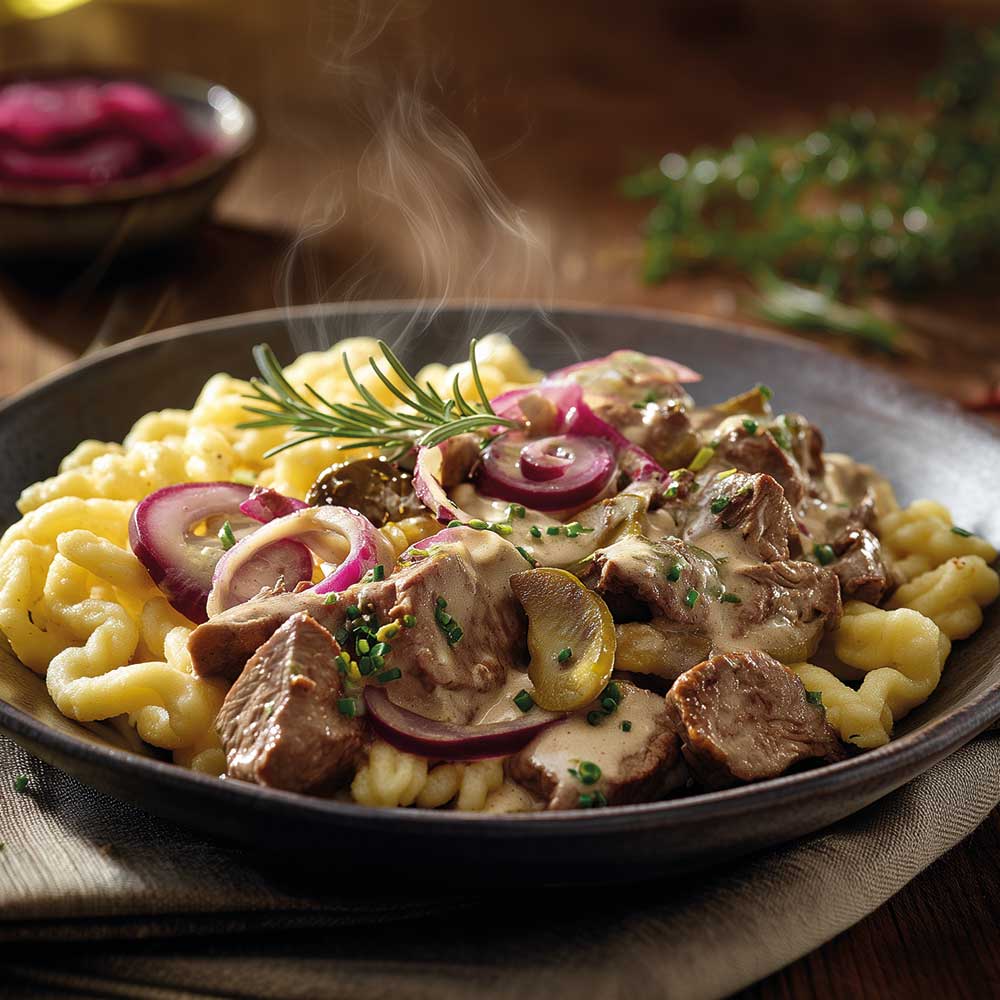 Zwiebel schälen, in Streifen schneiden und zum Fleisch geben. Weitere 3–4 Min. mitköcheln lassen. Inzwischen Spätzle in ein Sieb geben, mit kochendem Wasser übergießen und abtropfen lassen.
