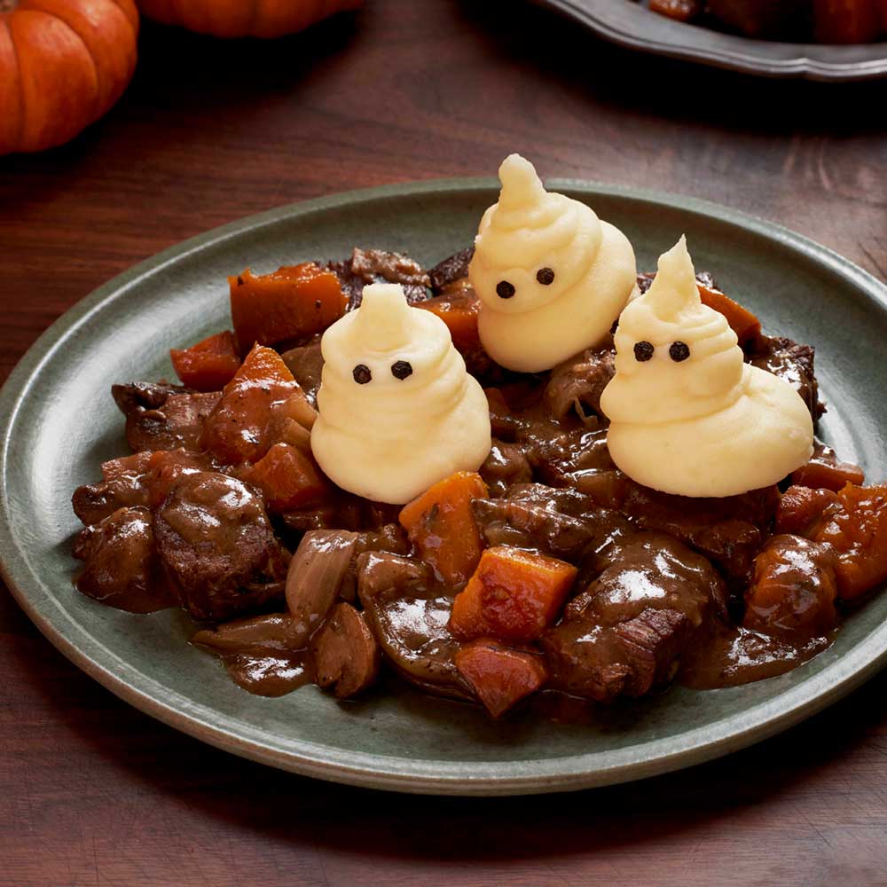 Gulasch auf Teller verteilen. Kartoffelpüree in einen Spritzbeutel füllen. In kreisförmiger Bewegung Kartoffeltupfen auf das Gulasch setzen. Für die geisterhaften „Augen“ jeweils Pfefferkörner ins Püree drücken.