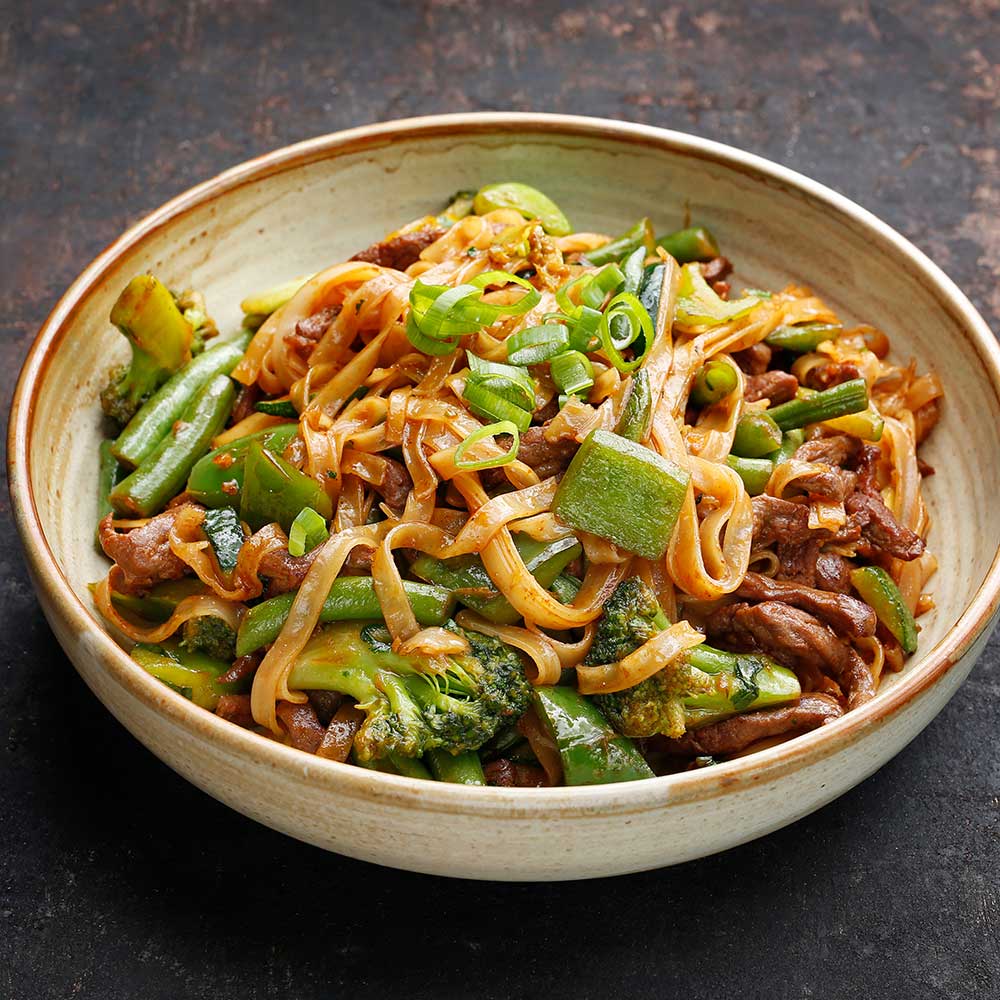 Restliches Öl im Wok erhitzen, das marinierte Fleisch portionsweise scharf anbraten, bis es Farbe bekommt. Gemüse und Nudeln zugeben, alles gut vermengen.