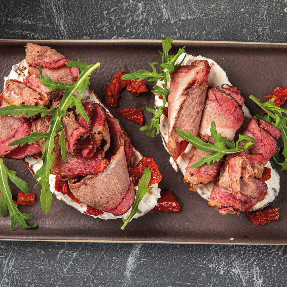 Frischkäse gleichmäßig auf die warmen Brotscheiben streichen. Leicht salzen und pfeffern. Getrocknete Tomaten auf dem Frischkäse verteilen. Roastbeef locker darauflegen, sodass leichte Wellen entstehen. Mit frischem Rucola garnieren.