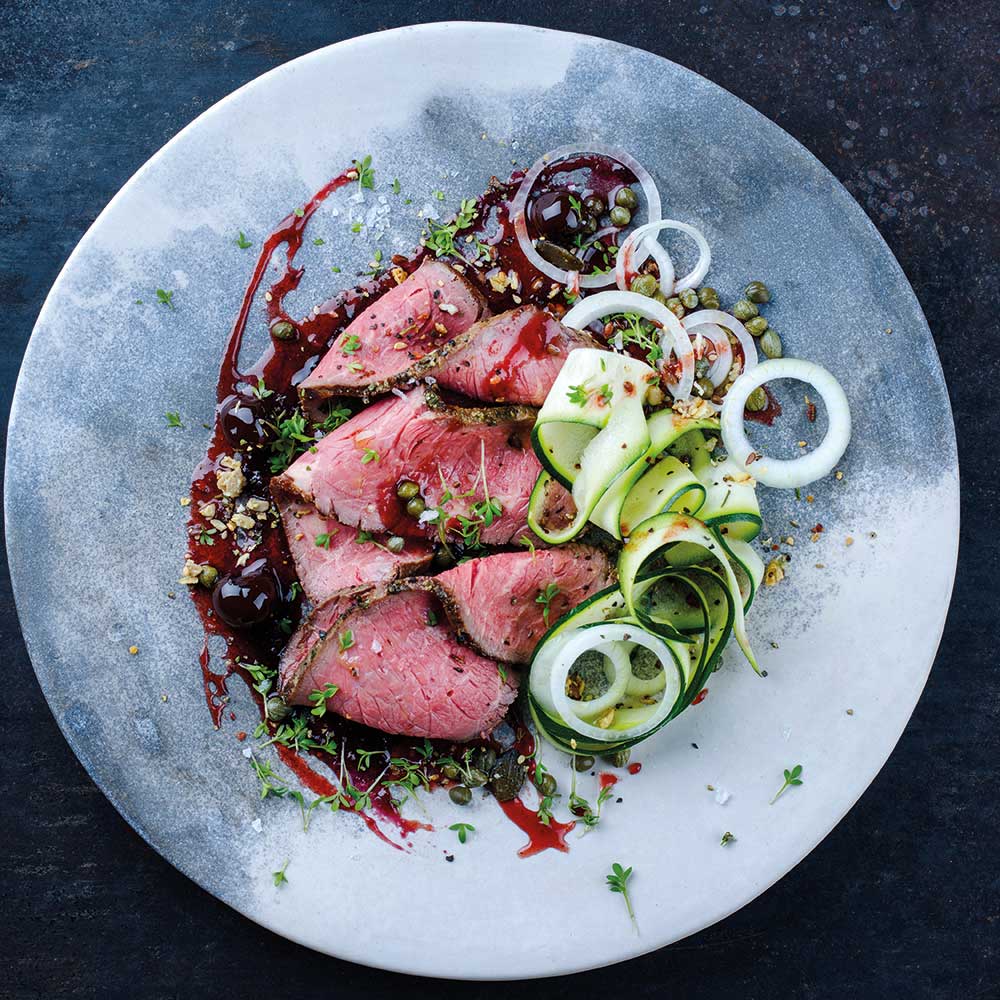 Kirschsauce als Spiegel auf Teller geben. Roastbeef in dünne Scheiben schneiden und darauf zusammen mit dem Gemüse anrichten. Nach Belieben mit Kapern und frischer Kresse garnieren.
