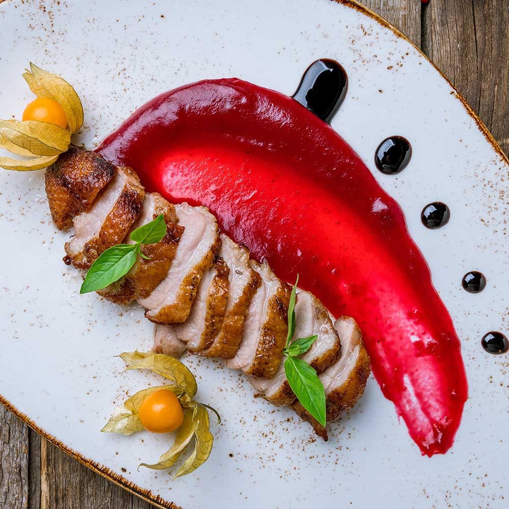 Entenbrust in Scheiben schneiden, auf einem Teller mit der Beerensauce anrichten. Mit Physalis, Balsamicotupfern und Basilikum garnieren. Dazu passen Kartoffelgratin oder Selleriepüree.