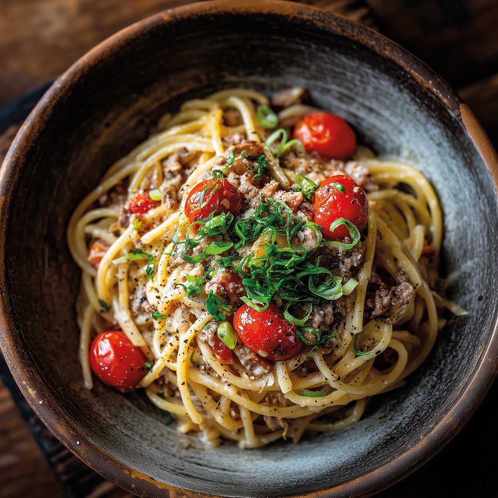 Nach Belieben mit Kräutern abschmecken. Mit den abgetropften Nudeln mischen, mit Lauchzwiebeln und Kirschtomaten toppen und servieren.
