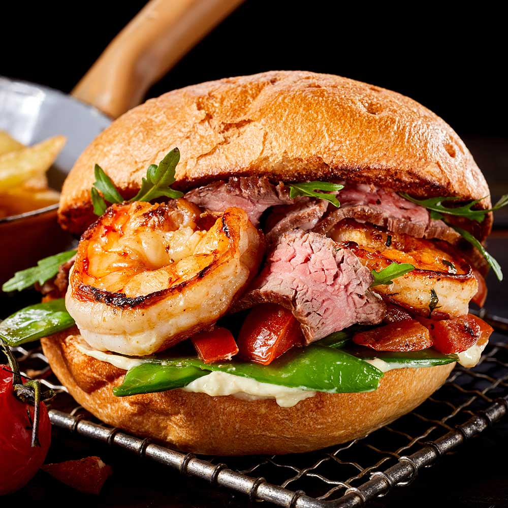 Buns halbieren, mit Butter goldbraun anrösten. Untere Brötchenhälfte mit der Sauce bestreichen. Zuckerschoten, Paprika und geröstete Tomaten daraufgeben. Rinderfilet und Garnelen darauflegen. Mit Rucola toppen. Brötchendeckel auflegen.