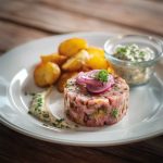 Knoblauch und Zwiebeln fein hacken, mit Senf und Blättchen von 3 Thymianstielen verrühren. Auf das Fleisch streichen, aufrollen und mit Küchengarn fixieren.